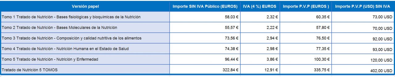 La compra la realizas siendo de España: entonces añadiremos un 4% de IVA a la compra del Tratado impreso y un 21% a la compra del e-book.
